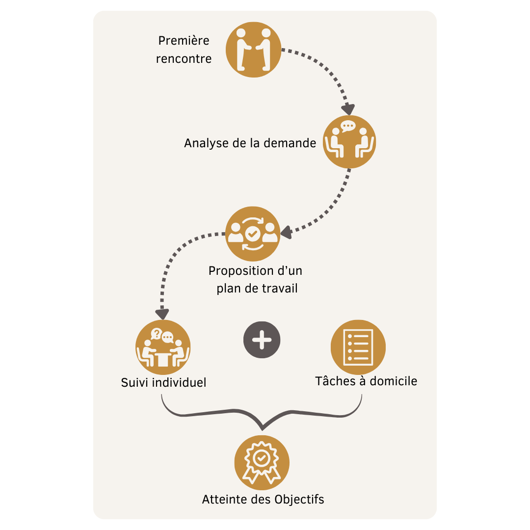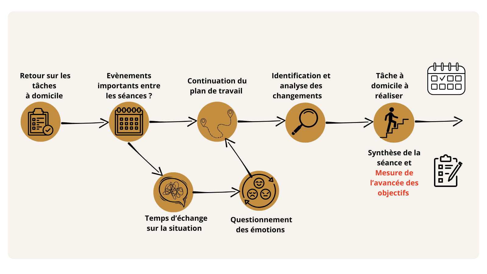 - Séance suivantes : réévaluation de la demande, compte rendu de l’avancée de la problématique, voir si les objectifs sont atteints.